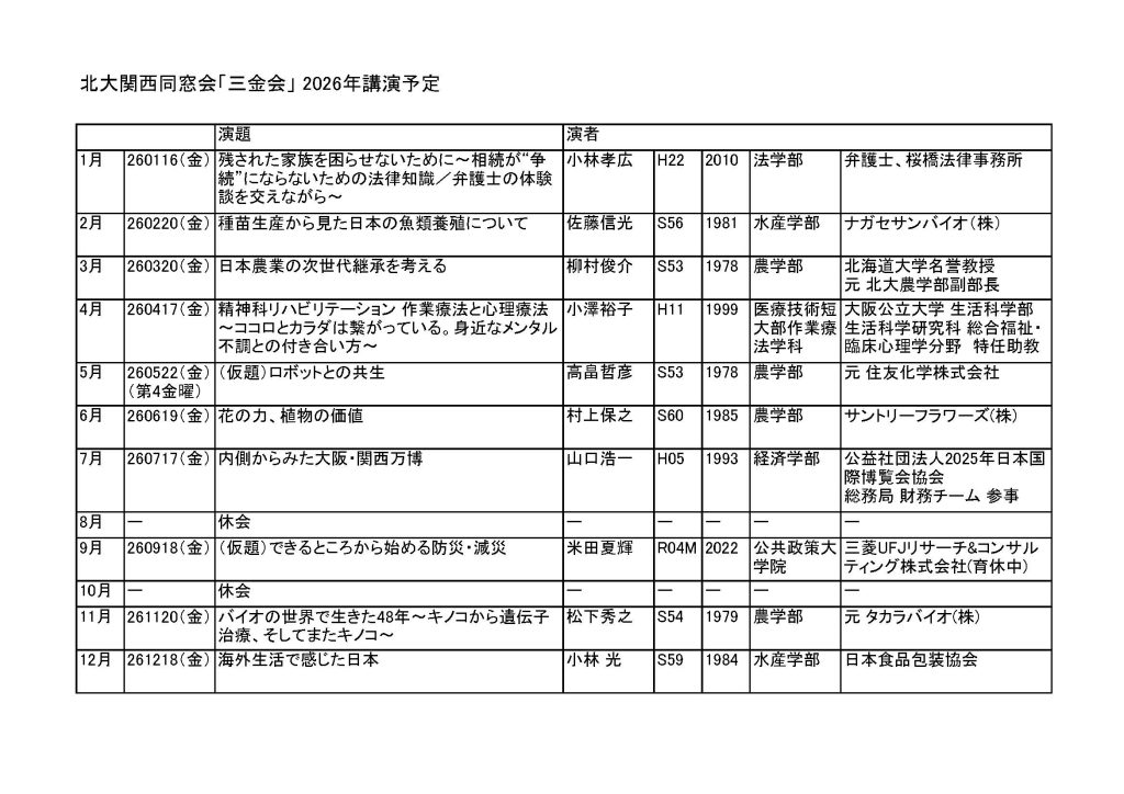 【北大関西同窓会】2026年「三金会」の講演予定について